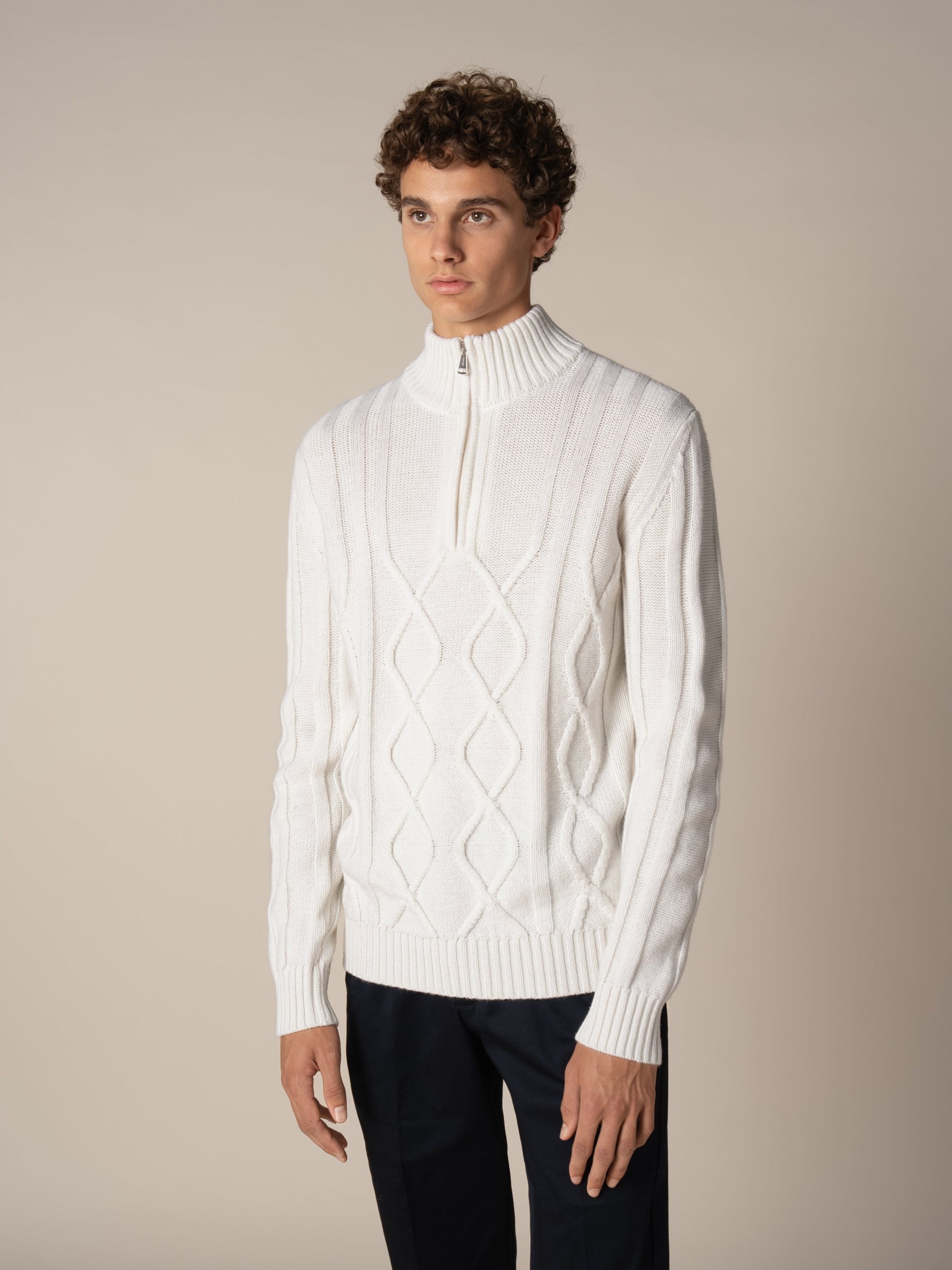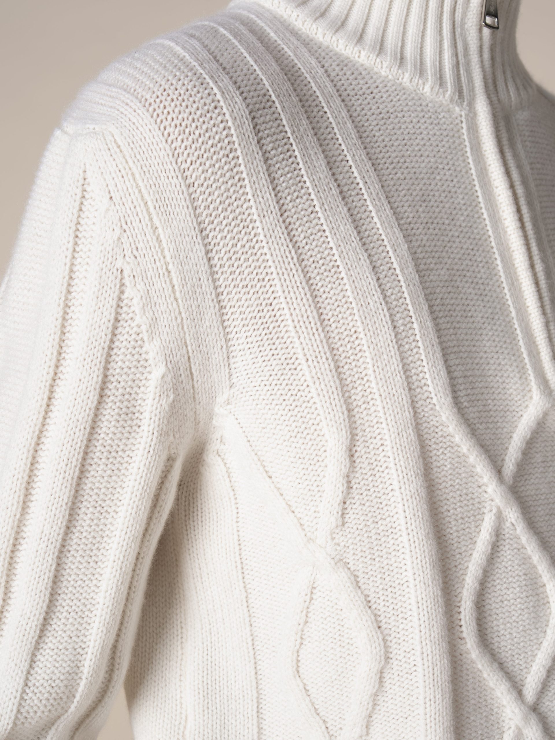 This sweater has been knitted in Italy from a Cashmere and Extrafine Merino wool blend that’s known for its remarkably soft feel. The Wintertime Sweater is finished with a cosy zip-up funnel neck and an elegant cable motif. This item is sure to keep you warm on colder days.
